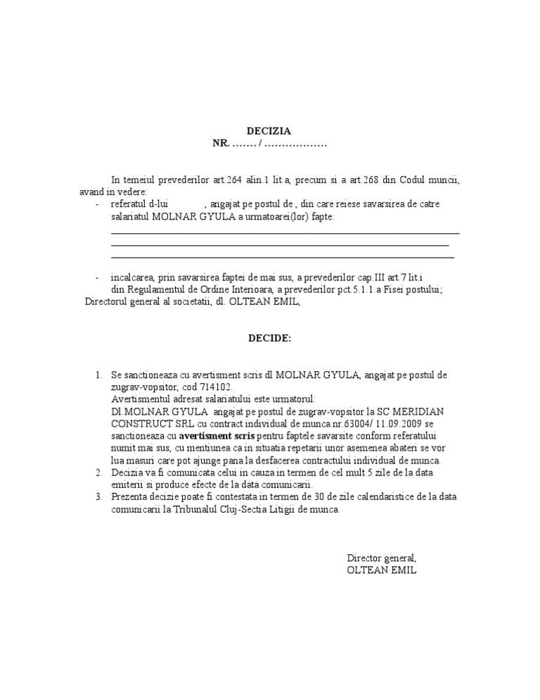 O disciplina sau modul, va fi scăzută nota la purtare cu câte un punct. O) se transmit cel târziu în ziua anterioară datei suspendării/datei încetării suspendării, cu excepția situației absențelor nemotivate când transmiterea în registru se face în termen de 3 zile. Rog model de decizie incetare cim invaliditate gr i sau ii.