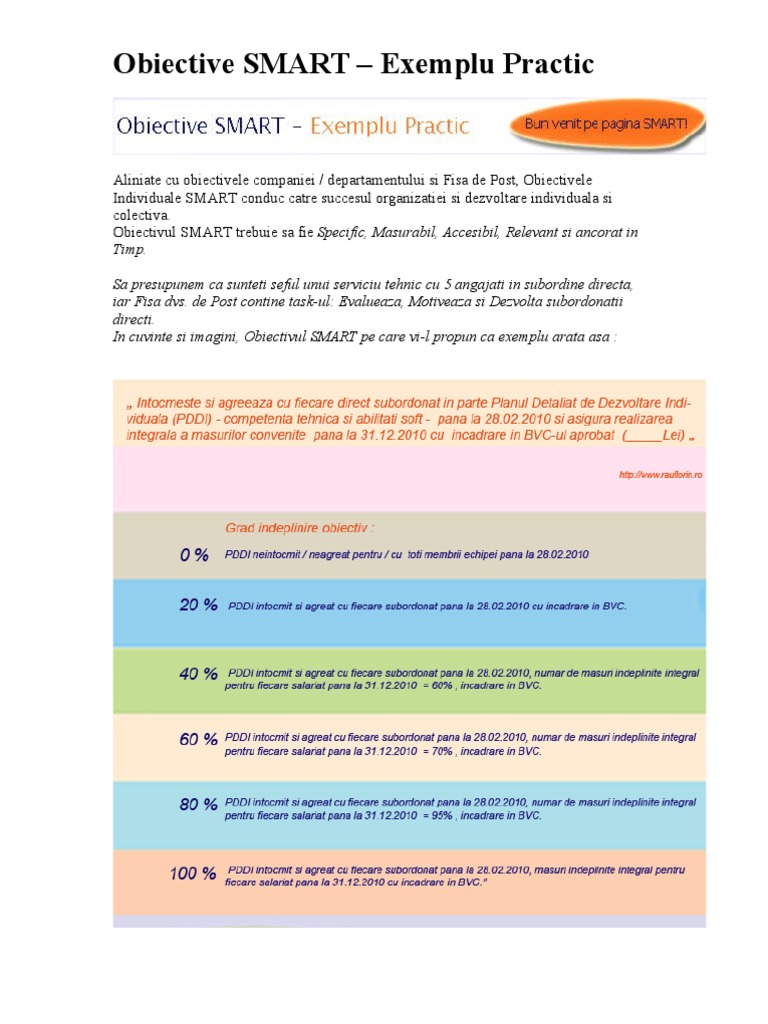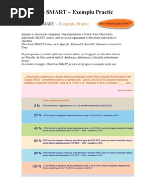 Exemple de obiective smart pe intelesul tau ghid de teorie si practica in resurse umane. Tema zilei este setarea obiectivelor smart. Aliniate cu obiectivele companiei / departamentului si fisa de post, obiectivele individuale smart conduc catre obiectivul smart trebuie sa fie specific, masurabil, accesibil, relevant si ancorat in timp.
