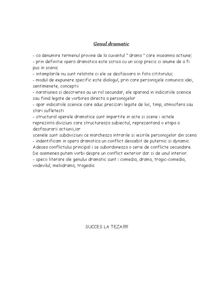 Opera dramatica este opera care a fost scrisa cu scopul de a fi interpretata pe scena. Operele dramatice au la baza o limitare . Operele dramatice au la bază o limitare . Care sunt trasaturile genului dramatic. Acest gen literar are trasaturi prin . Genul dramatic cuprinde totalitatea operelor scrise pentru a fi reprezentate pe scena unui teatru. Operele aparținând genului dramatic au trăsături specifice: Cuprinde opere redactate cu scopul punerii n scen, este destinat, prin definiie, interpretrii scenice comunicarea presupune 3 . Genul dramatic cuprinde totalitatea operelor scrise pentru a fi reprezentate pe scena unui teatru. Operele dramatice păstrează o anumită structură: Astfel, operele dramatice impun o . Genul dramatic cuprinde totalitatea operelor in versuri sau in proza, create special pentru a fi reprezentate pe scena. Acțiunea este declanșată de conflictul dramatic ce constă în confruntarea a două personaje, .
